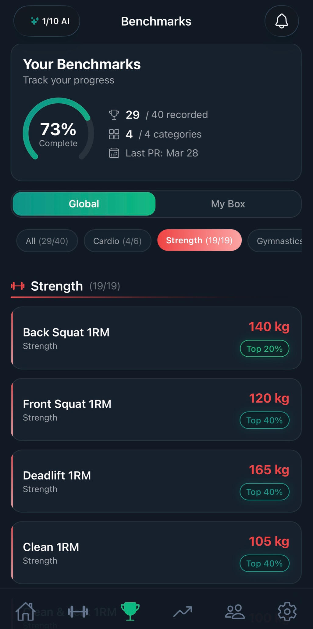 Log benchmarks and see your community percentile. Track skill progressions, earn badges, build streaks, and follow AI-generated training plans for strength and gymnastics.