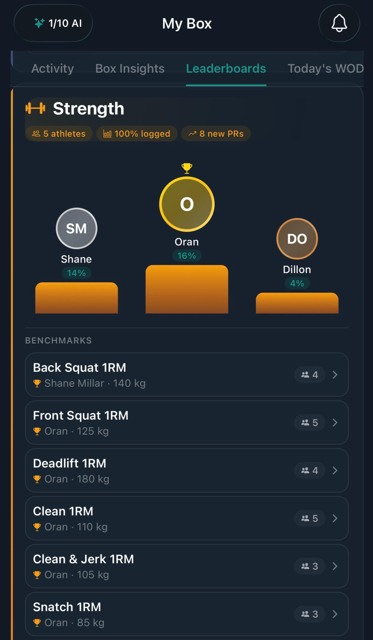 Join your gym's community with a simple code. See daily WOD leaderboards, give fist bumps, track your box's weekly insights, and see how you rank against your training partners.