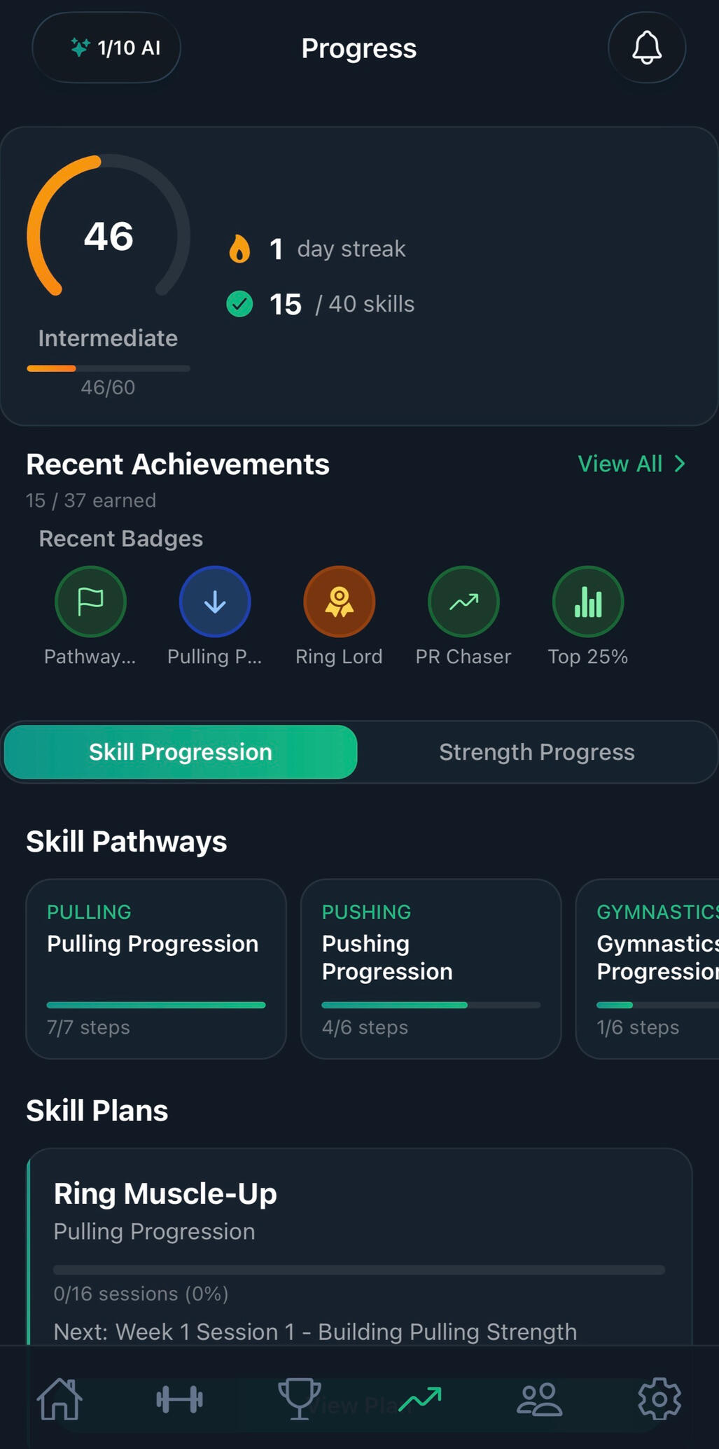Track your skill score across pulling, pushing, gymnastics, and Olympic lifting. Follow AI-generated training plans, unlock progression steps, earn badges, and build streaks — all designed to turn your weaknesses into strengths.
