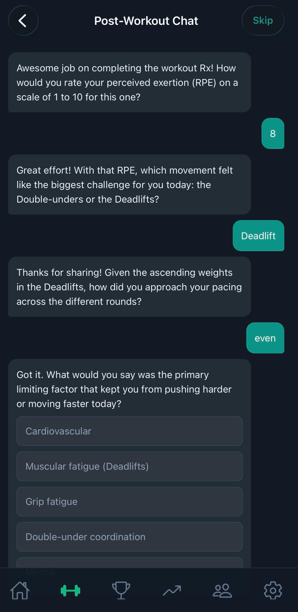 WodStrat gives you an AI coach in your pocket. Get personalised strategy before every workout, track your benchmarks against the community, and unlock skills and badges as you progress. Free to start — try Premium for 14 days.