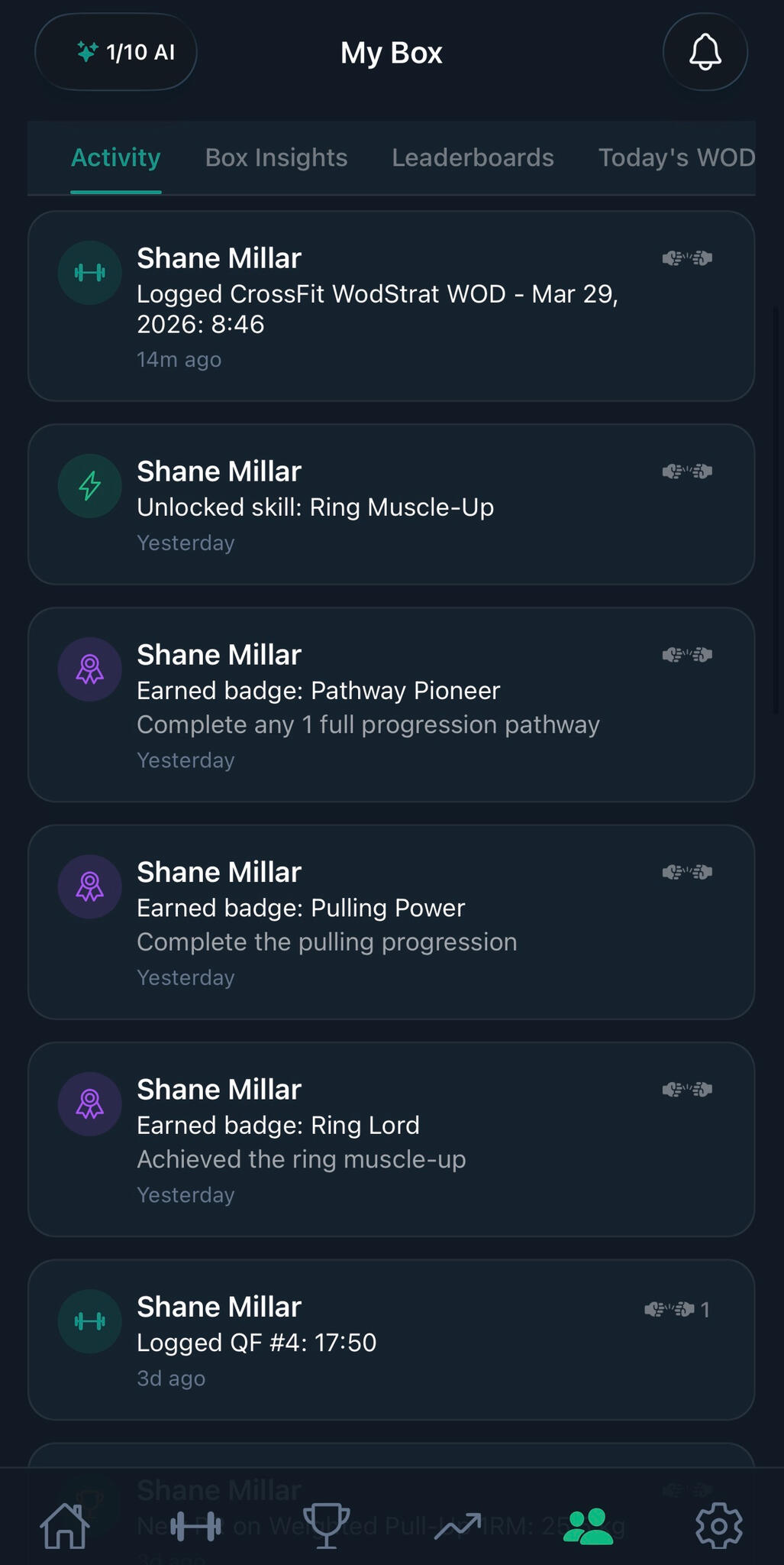 See who's training, who hit a PR, and who just earned a new badge. Give fist bumps, check the weekly insights, and keep each other accountable — all inside your box.