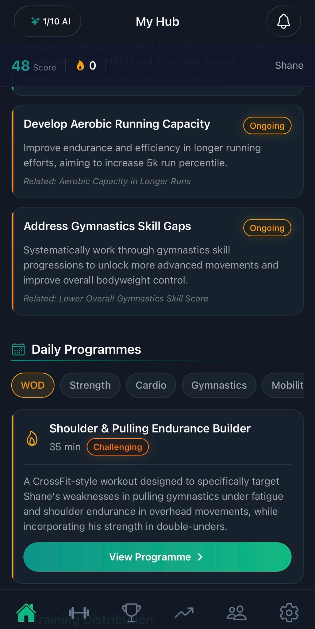 Premium members get a daily AI coaching hub — fitness score, strength and weakness analysis, personalised training programmes, and weekly activity tracking. All generated fresh each day.