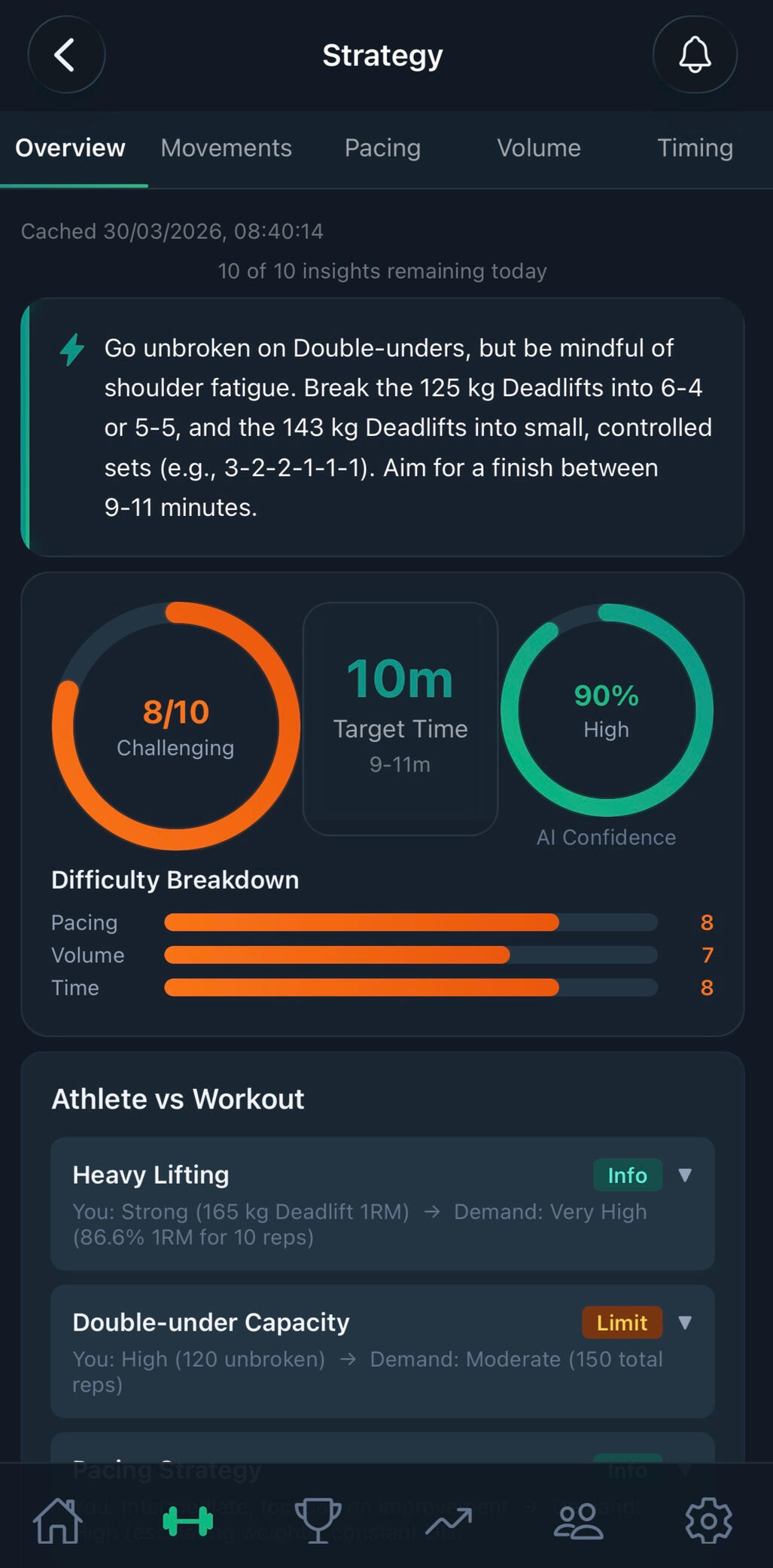 Upload any workout and get an instant AI breakdown — difficulty rating, pacing strategy, movement tips, and volume analysis tailored to your fitness level.